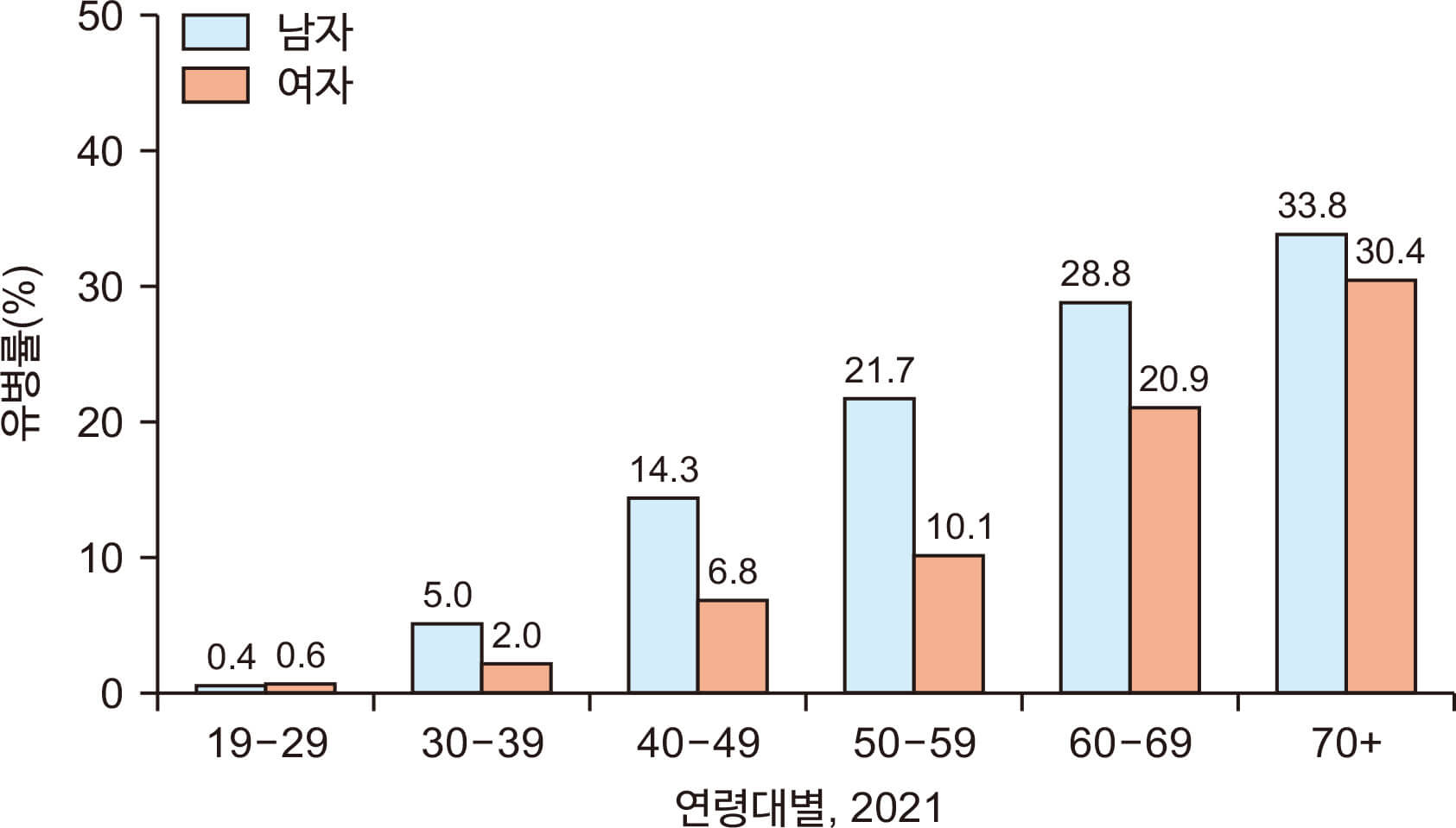 우리나라의 10명 중 1명이 당뇨병이라고 합니다. 실제로 2011년도부터의 질병관리청의 조사에 따르면 남자의 유병률이 10%를 넘고 있습니다. 2021년도 조사또한 30대부터 유병률이 급격하게 증가하고 있는 것을 볼 수 있습니다. 당뇨병 초기증상을 보이는 환자까지 포함하면 10명 중 3명이 당뇨병이 아닐까 예측을 하는데요. 그만큼 아주 흔한 질병이라고 할 수 있습니다.