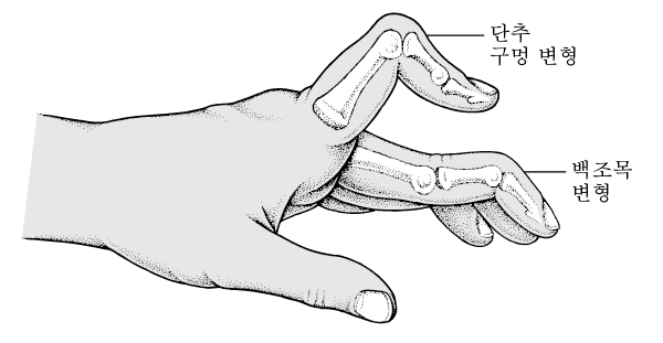 시간이 지남에 따라 류마티스 관절염은 특히 손과 손가락의 관절 기형으로 이어질 수 있습니다. 여기에는 백조목 변형이나 부토니에르 변형(단추구멍 변형)이 포함될 수 있습니다.