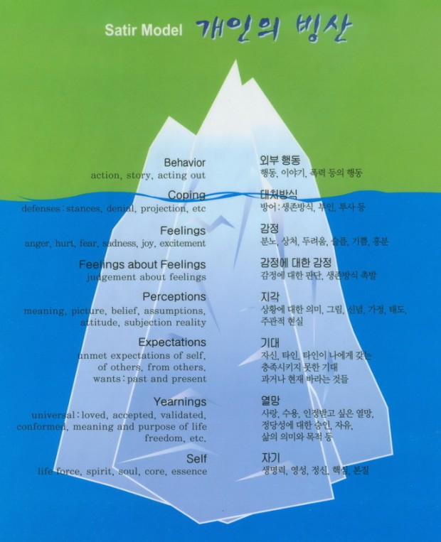 내담자의 경험을 빙산에 비유하여 겉으로 보이는 인간의 행동은 수면 위에 드러난 빙산의 한 부분에 불과하다고 보았습니다. 수면 위의 행동, 수면 아래의 감정, 기대, 지각, 열망이 있다고 보고 개인의 내적 과정을 이끌어 내는데 활용합니다. 사티어는 문제행동에만 초점을 둘 경우 1차 수준의 변화만을 가져올 뿐이라고 주장합니다. 때문에 빙산을 탐색함으로써 행동의 변화뿐만 아니라 감정, 지각, 기대, 열망, 자기 같은 2, 3차 수준의 변화를 유도하여 내담자가 이러한 사항들을 자각할 수 있도록 도와야 한다고 말합니다.