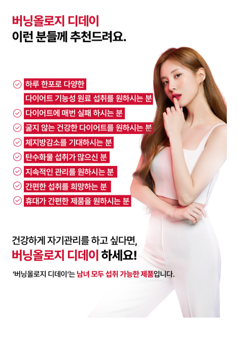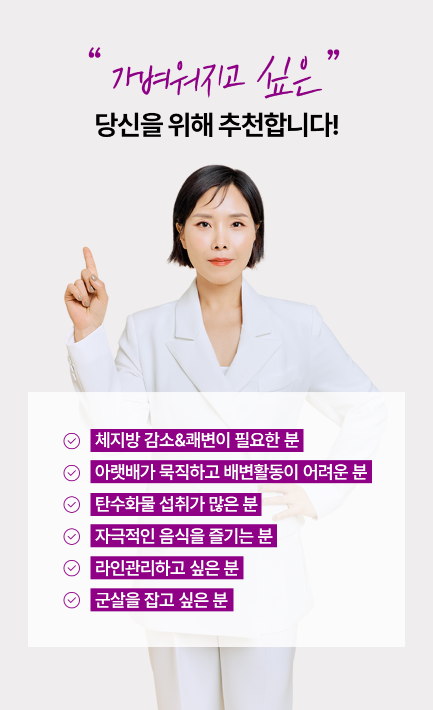 2) 성분 및 효능 – 가르시니아 캄보지아 추출물(HCA)는 100% 식물성 원료로서 탄수화물이 지방으로 합성되는 것을 억제하여 체지방 감소에 도움을 줄 수 있습니다. 또한 난소화성말토덱스트린은 100% 식물성 원료로서 옥수수전분을 통해 얻은 식이섬유로 배변활동을 원활하게 하며, 식후 혈당상승 억제와 혈중 중성지질 개선에 도움을 줄 수 있습니다. 부원료 52종 과채와 콜라겐, 7종 비타민과 미네랄 등이 함유되어 있습니다.