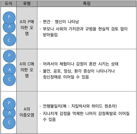 - 혼합(contamination): 각 자아경계가 지나치게 이완되거나 약화되어 특정 자아상태가 자아경계를 침범하는 경우입니다.