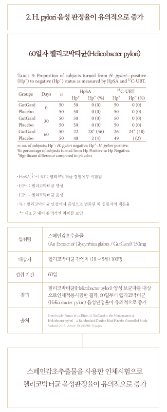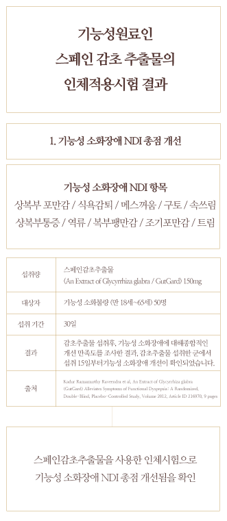 연구에 따르면 스페인감초 추출물을 섭취한 후 15일부터 기능성 소화장애가 개선되었습니다. 또한 헬리코박터균 음성판정률이 유의적으로 증가한 것이 확인되었습니다.